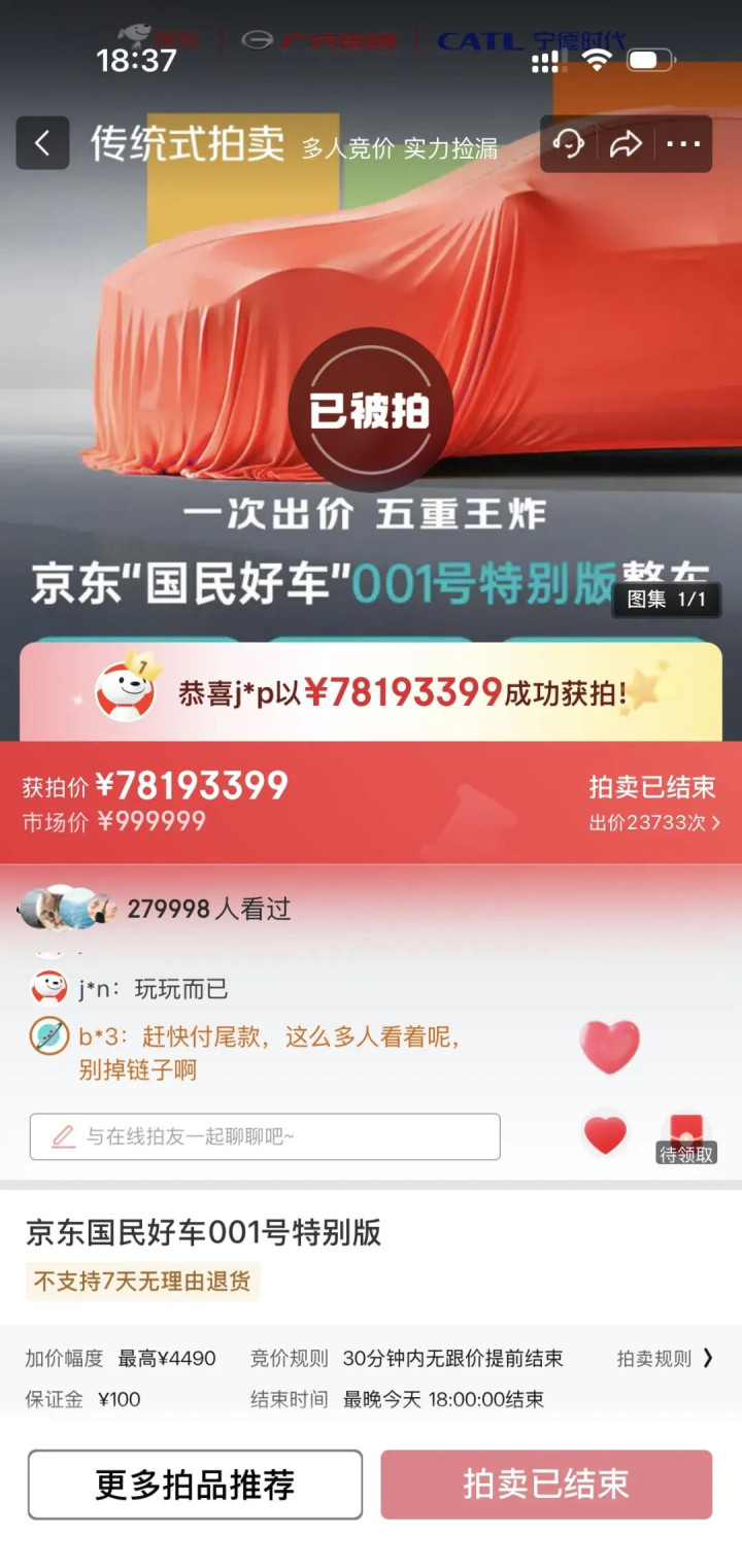 此次“国民好车”001号拍出7819万元的天价,无疑为京东的汽车战略赚足了眼球。这场吸引了超过20万用户“围观”的拍卖,是京东在汽车领域布局的一次高调“肌肉秀”。